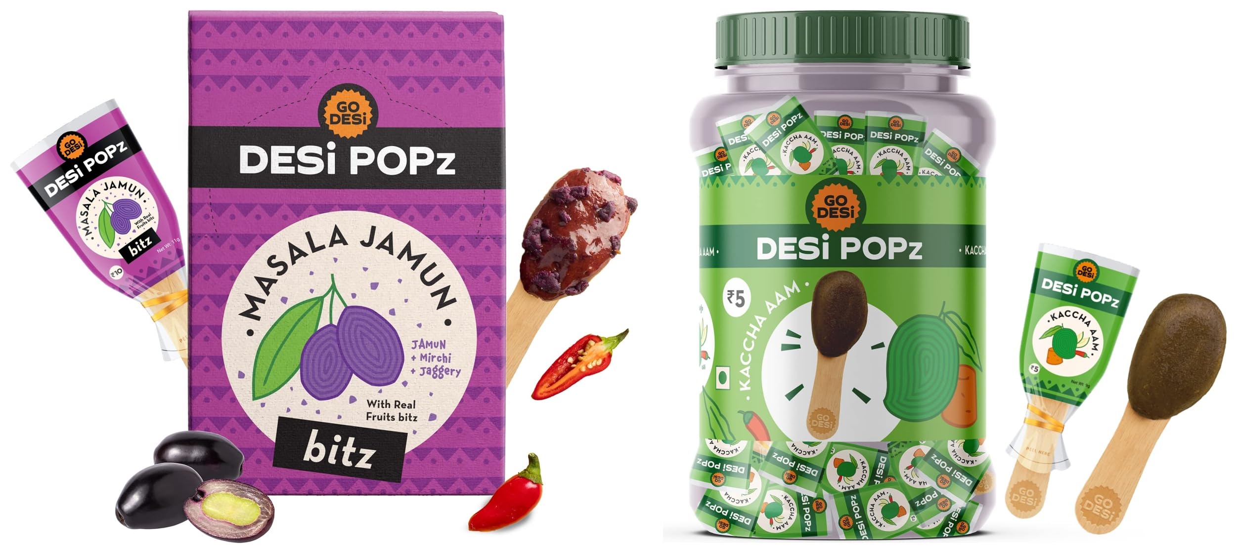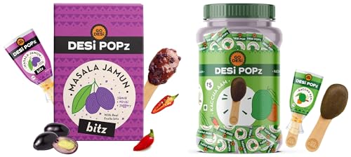 GO DESi Popz Kaccha Aam | 100 Pieces | Aam Candy | Fruit Snacks | Sour Candies | Lollipop | Raw Mango CandyLollipop with a desi twist. Made with real-kaccha aam jaggery and Indian spices it is the perfect mixture of sweet sour and spice.GO DESi POPz with Bitz | Masala Jamun | 50 Pcs | Fruit Snacks | Java Plum | 400 gmYour favourite DESi lollipops just got bigger and better with the new DESi POPz with Bits- Masala Jamun: A mouthwatering chatpata treat featuring the goodness of fresh Jamuns jaggery DESi masala and some extra love. Now with real jamun fruit bits for some extra DESi indulgence!