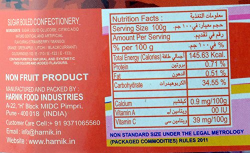 The product in displays is a pack of harty beauty which consists of sugar liquid glucose citric acid (e-330)nature identical and artificial flavouring(strawberryorangemangogreen applegreen mangolitchitamarindmilk)colorings(e-133e-122 e-110e-102)contains permitted synthetic food colours and added flavours.The package contains 200 pcs and has shelf life of 24 months.It is recommended to store in a cool & dry place away from direct sunlight and away from odourful products such as soaps etc.