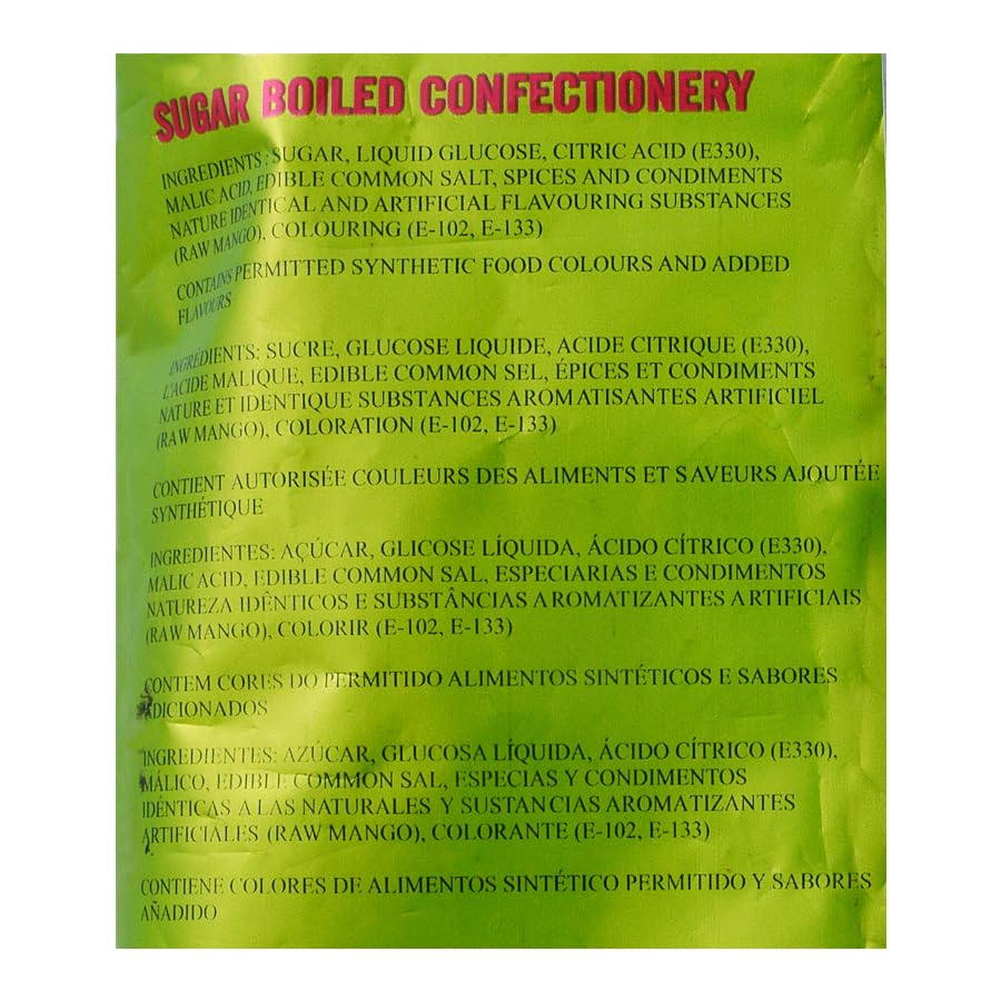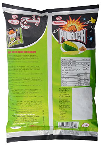 The product in displays is a pack of punch candy which consists of sugar liquid glucose citric acid (e330) malic acid edible common salt spices and condiments nature identical artificial flavouring substances (raw mango)colouring (e-102 e-133)contains permitted nature and synthetic food colours and added flavours.The package contains 170 pcs and has shelf life of 24 months. It is recommended to store in a cool & dry place away from direct sunlight and away from odourful products such as soaps etc.