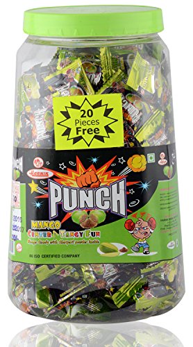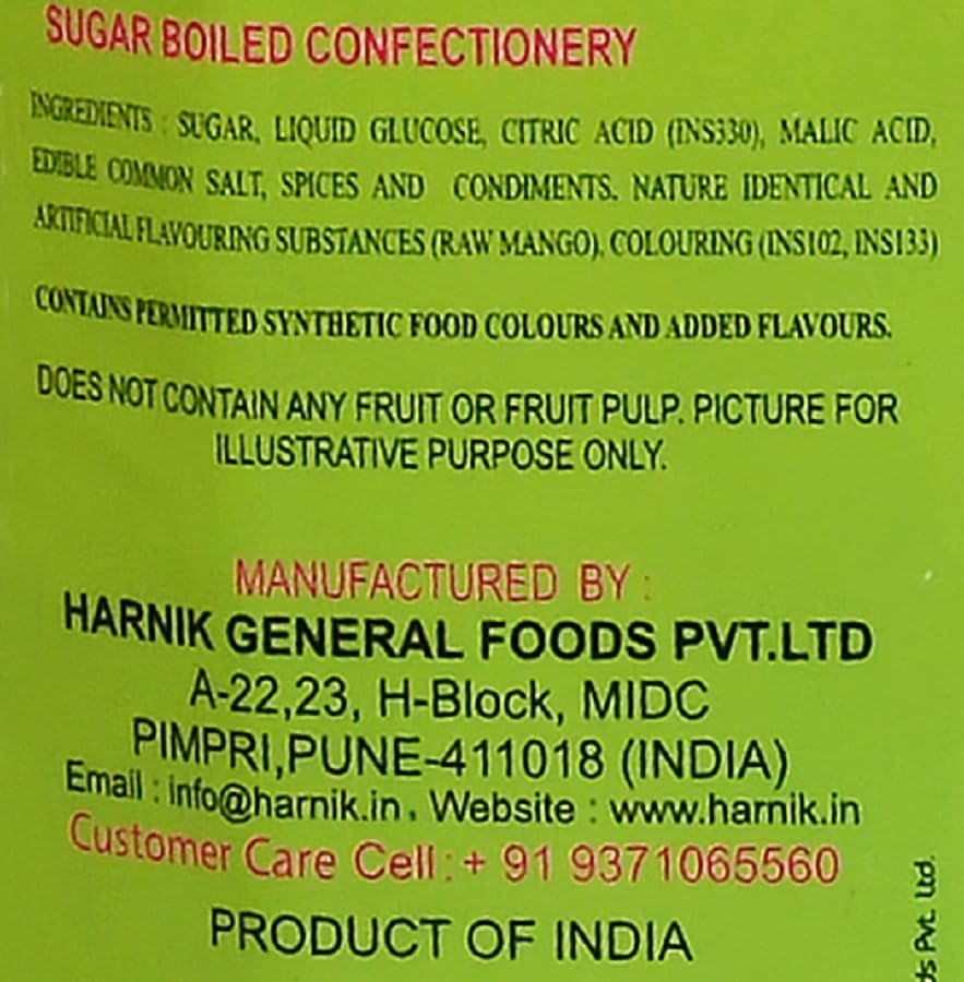 The product in displays is a pack of punch candy which consists of sugar liquid glucose citric acid (e330) malic acid edible common salt spices and condiments nature identical and artificial flavouring substances (raw mango)colouring (e-102 e-133)contains permitted nature and synthetic food colours and added flavours. The package contains 220 pcs and has shelf life of 24 months. It is recommended to store in a cool & dry place away from direct sunlight and away from odourful products such as soaps etc.