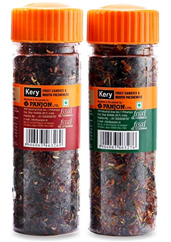 Panjon pioneer in health products since 1977 present their premium range of Kery Mouth fresheners & Kery Candies. Kery Pachak Mukhwas are Infused with the goodness of handpicked fruits and best quality ingredients to stimulate the digestive enzymes and acts as an appetizer. It helps in digestion & improves stomach health. Try all 18 flavours of Kery Mouth fresheners & 10 Flavours of Kery Fruity Candies!!!! Kery Anardana Goli Aam Papad Jeera goli White sweet saunf Colorful saunf Flax seeds Banarasi paan Calcutta paan Sounf fresh mix Kashmiri Navratan Mix Anar Amla Chatpata Khajoor Imli  Ladoo Bambaiya mukhwas Hing peda Amla Candy Chatpata amla and more. Try all our 20 flavours to tickle your taste buds. To maintain freshness shake the bottle upside down and keep it in a cool and dry place. This Product is 100% Vegetarian.