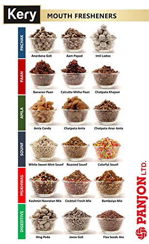 Panjon pioneer in health products since 1977 present their premium range of Kery Mouth fresheners & Kery Candies. Kery Pachak Mukhwas are Infused with the goodness of handpicked fruits and best quality ingredients to stimulate the digestive enzymes and acts as an appetizer. It helps in digestion & improves stomach health. Try all 18 flavours of Kery Mouth fresheners & 10 Flavours of Kery Fruity Candies!!!! Kery Anardana Goli Aam Papad Jeera goli White sweet saunf Colorful saunf Flax seeds Banarasi paan Calcutta paan Sounf fresh mix Kashmiri Navratan Mix Anar Amla Chatpata Khajoor Imli  Ladoo Bambaiya mukhwas Hing peda Amla Candy Chatpata amla and more. Try all our 20 flavours to tickle your taste buds. To maintain freshness shake the bottle upside down and keep it in a cool and dry place. This Product is 100% Vegetarian.