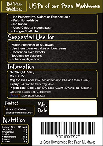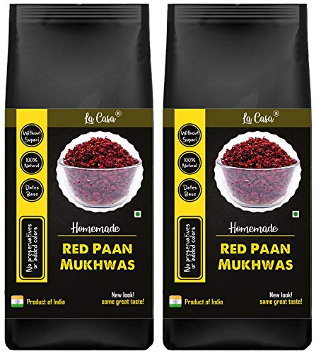 La Casa brings to you a Homemade delicious fun Mouth Freshener / mukhwas to relish your cravings for tingling taste and mouthwatering aroma. Calcutta Meetha Pan or Gulkand Paan stuffed with Sweet Delicious and Juicy ingredients are a traditional iconic mouth freshener in India. It is made with 100% Natural ingredients and contains no harmful items such as Tobacco or Limestone Paste. It acts as an appetizer and strengthens the digestive process and also promotes absorption of nutrients. This product will remind you of your childhood days. Eat them up at your past time. No Added Flavours. Carefully Packed in Food Grade reseable Pouch.