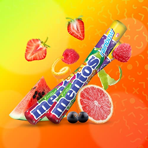 Mentos Rainbow Mentos Discover the exciting taste of Mentos Rainbow a mix of watermelon cherry orange raspberry grape pineapple and strawberry. Round chewy candies that are crunchy outside and chewy inside.