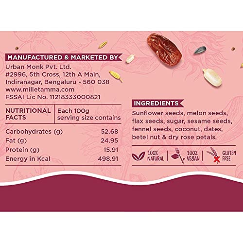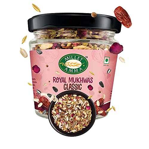 Millet Amma Royal Classic is a nutrition packed seed cocktail to enjoy after every meal to feel satiated. Making Royal Classic as a part of your lifestyle helps you maintain good health. It is loaded with Omega 3 fatty acids helps in maintain the level. Specifications: Vegan -Free & Natural. Ingredients: Sunflower seeds Melon seeds Flaxseeds Fennel seeds seeds Sugar Dates nuts Dry rose pet. Storage: Keep your favorite Royal Classic at a cool and dry place for 6 months. Net Wt: 100 gms