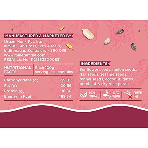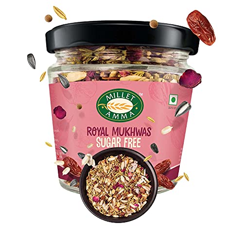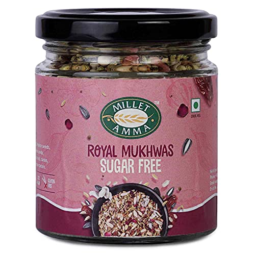 Millet Amma Royal Sugarfree is a nutrition packed seed cocktail without any sugar to enjoy after every meal to feel satiated. Royal Sugarfree is packed with antithat help you in hair growth and helps you look younger. It contains lignans which help prevent carcinogenic effects (anti-properties) It naturally ifies your body. Specifications: Vegan -Free & Natural. Ingredients: Sunflower seeds Melon seeds Flaxseeds Fennel seeds Dates nuts & Dry rose pet. Storage: Keep your favorite Royal sugar-free at a cool and dry place for 6 months. Net Wt: 100 gms