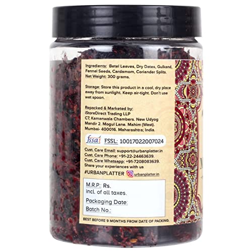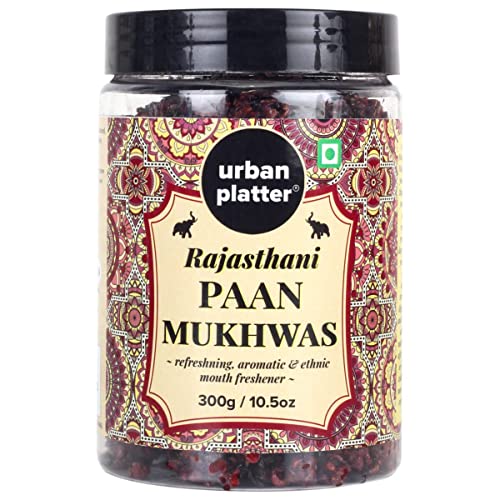 Urban Platter Rajasthan paan mukhwas 300g/ 10.5oz [mouth freshener digestive after-meal snack] a delicious fun mouth freshener/ mukhwas to relish your cravings for tingling taste and mouth-watering aroma. Will remind you of your childhood days. Eat'em up at your past time. Acts as an appetizer. It strengthens the digestive process and also promotes absorption of nutrients. Indian after-meal snack or digestive aid widely used as a mouth freshener especially after meals. Urban Platter - simply good food.