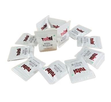 Tulsi Royal Khajoor (PACK OF 12) small handy pack silver coated dates are a delightful and convenient way to enjoy the rich sweet taste of dates. These bite-sized treats are coated in a thin layer of edible silver adding a touch of elegance and making them perfect for festive occasions or as a special indulgence. The pack of 12 small handy packs ensures you always have a healthy snack on hand whether at home work or on-the-go. Dates are a natural source of energy fiber and various essential nutrients making them a guilt-free indulgence. These silver-coated dates are a unique and sophisticated take on a traditional favorite allowing you to savor the flavors of the Middle East with a modern twist. Enjoy the rich caramelized taste and chewy texture of these delectable dates perfect for sharing or savoring alone.
