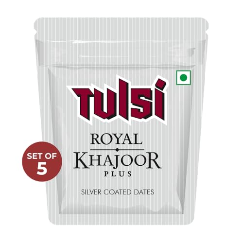 Tulsi Royal Khajoor Plus | Pack of 5 (13 Gram x 5) | Silver Coated Khajoor | Dates | Mint Mouthfreshner | Zipper Pack