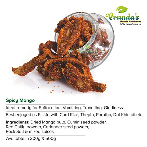 Buy 500 GM Vrunda's Spicy Mango And Get 200 Gm Vrunda's Chulbuli Imli FREE - Save Rs 142/- Ingredients: Dried Mango pulp Cumin seed powder Red Chilly powder Coriander seed powder Rock Salt and mixed spices Rich source of Vitamin C. Good for hair stomach blood circulation Maintains Cholesterol levels teeth and eyes.