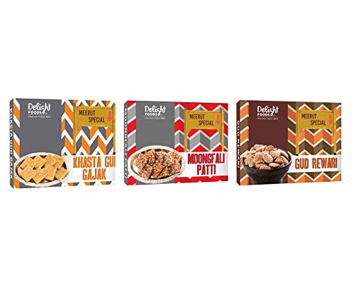 Delight Foods presents the most famous Rewri Gajaks and Peanut Chikki (Moongfali Patti) from Meerut. Try our signature mini bite sized gud and sesame sweetmeat - The Gud Rewri (Revdi)! Its made with 100% pure jaggery pure desi ghee cloves cardamom and sesame. We promise you will fall in love with this specialty from Old Delhi (Chandni Chowk). Besides being delicious our selection of gajak and rewri are very healthy and helps ward off cold. Prepared by the famous artisans from Meerut our rewri has an authentic taste because its special traditional recipe and style of preparation. Perfect for own consumption or gift to your loved ones on any celebration or occasion.