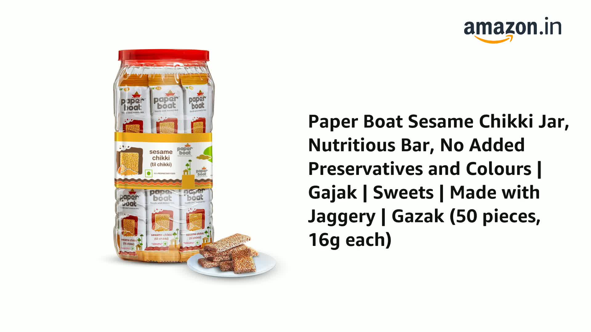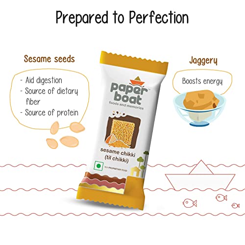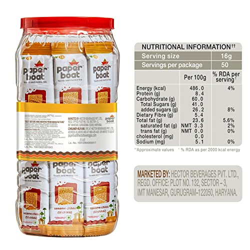 HomeGrocerySweetsChikkiPaper Boat Sesame Chikki Jar Original Nutritious Bar No Added Preservatives and Colours | Gajak | Sweets | Made with Jaggery | Gazak (50 pieces 16 grams each)