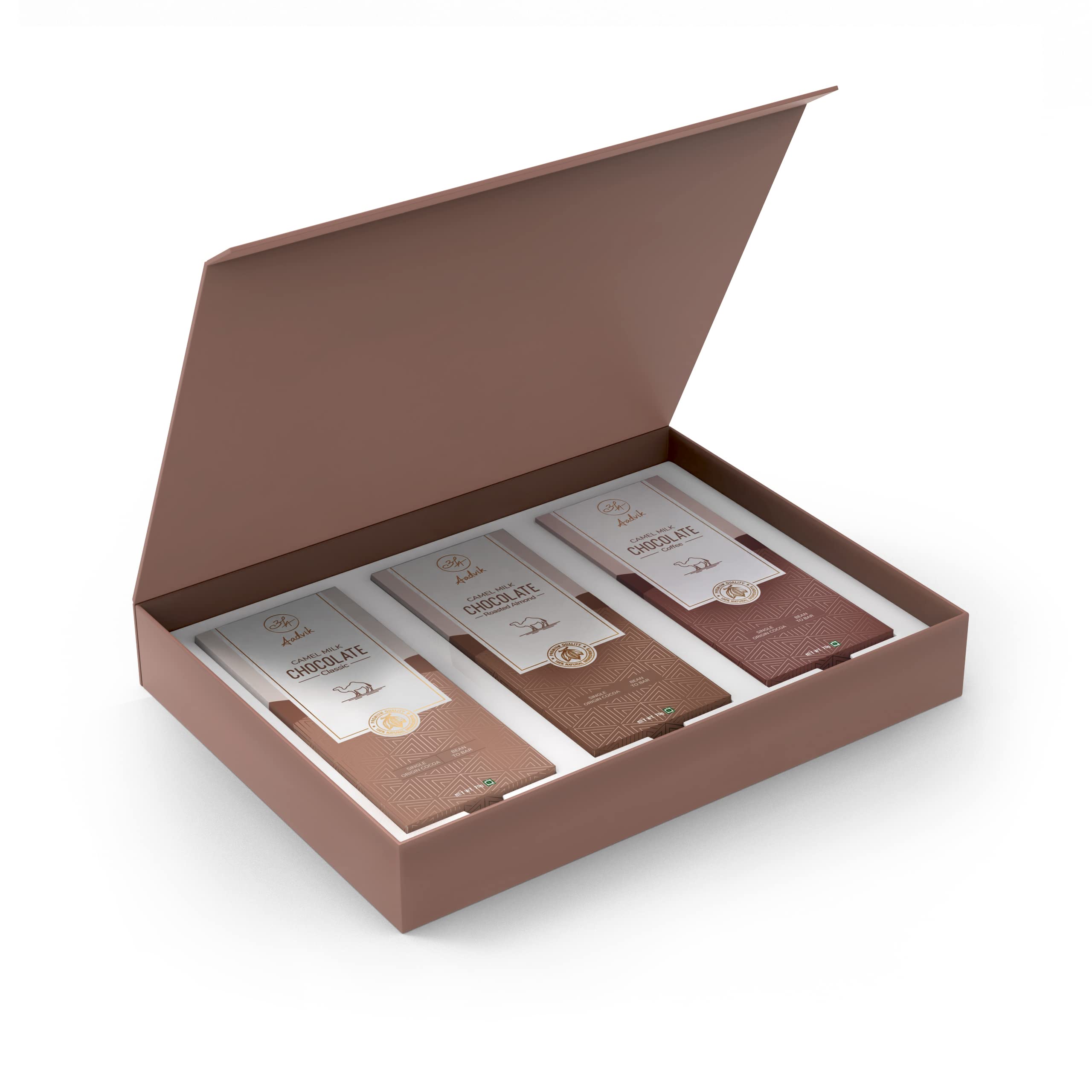 HomeGrocerySweetsChocolatesAadvik Premium Gift Box of Camel Milk Chocolates | Single Origin Cocoa from Kerala |Natural Ingredients ONLY |Pack of 3 |Coffee |Roasted Almonds |Classic |210gms