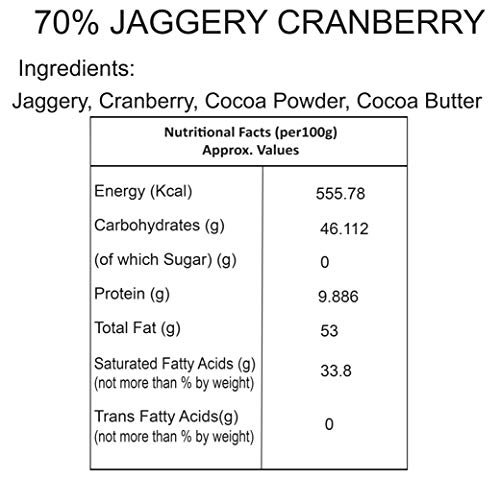 Bogatchi 70% dark jaggery chocolate provides best quality dark chocolate experience with real cocoa content. These are intense dark chocolate for true chocolate lovers. Perfect choice for dark chocolate enthusiasts. Comes loaded with cranberries