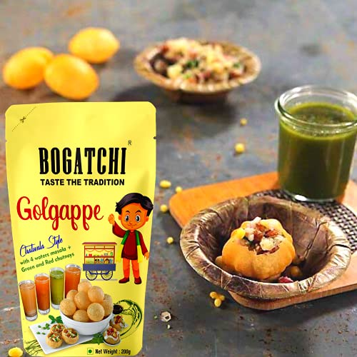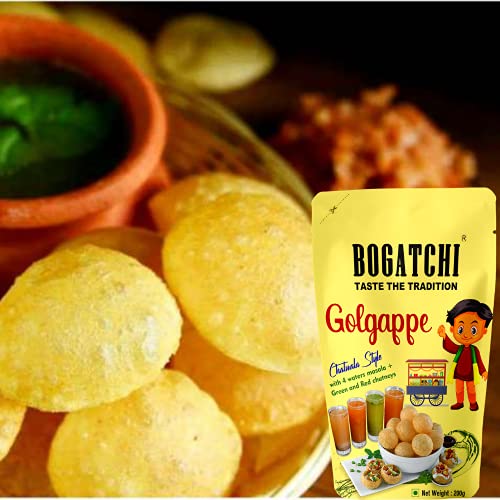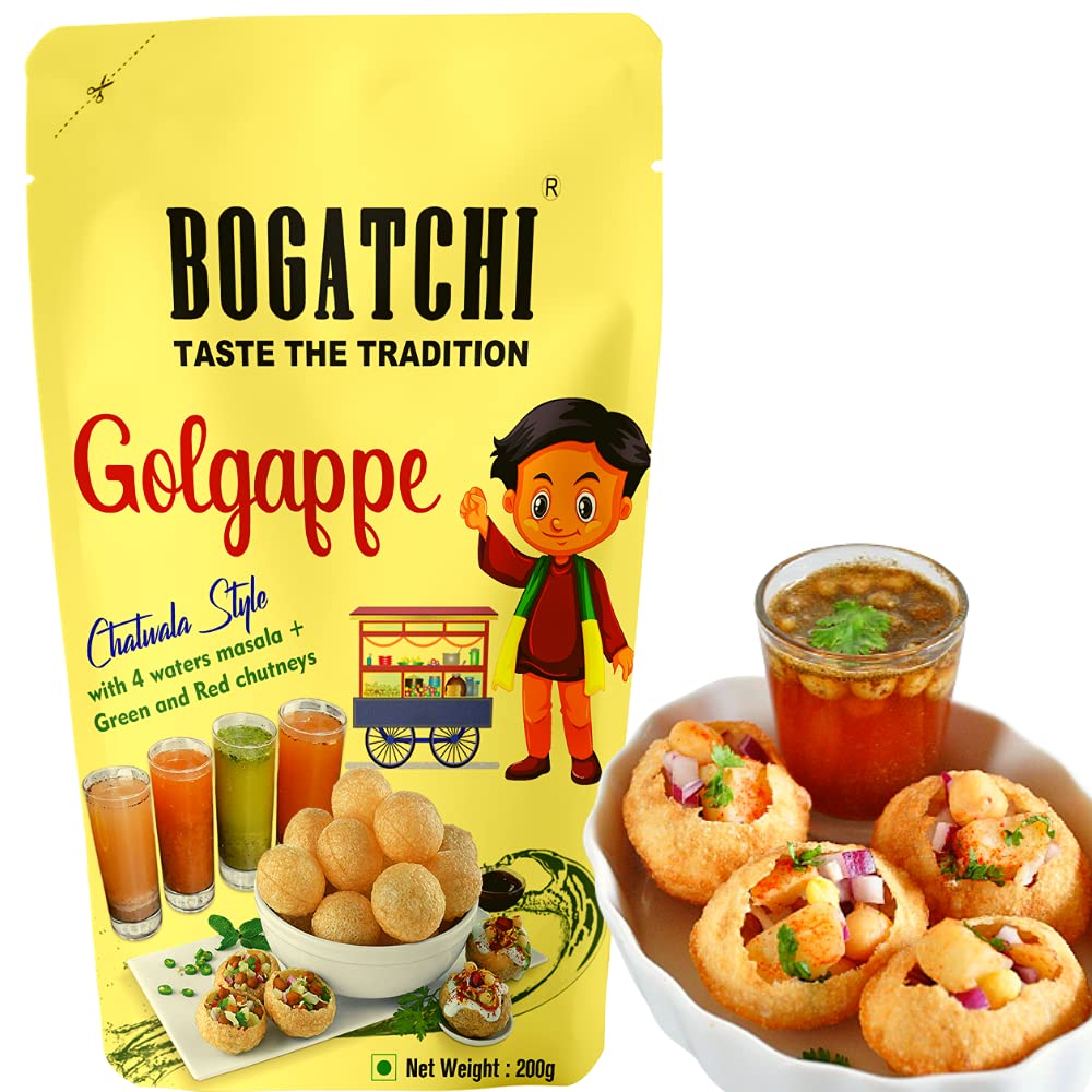 BOGATCHI Golgappe Pani Puri will become your favourite snack once you taste it. We believe in Simple good food that's why our gol gappe is made of best natural ingredients. To have full chatwala experience the packet includes 4 waters masala green and red chutneys. These ready to fry atta golgappe can be made within a minutes. The quality is good. We offer clean and air-tight pani puri packets for keeping golgappa puris fresh and not loosing their taste.