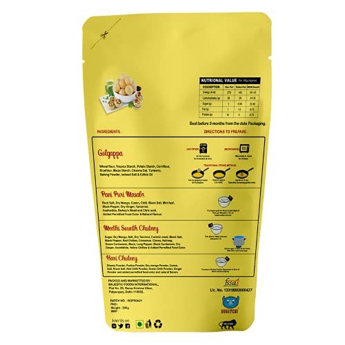 • Packet contains - Dry Atta Golgappa Pani Puri Masala Meethi Sounth Chutney Hari Chutney. Weight - 200g