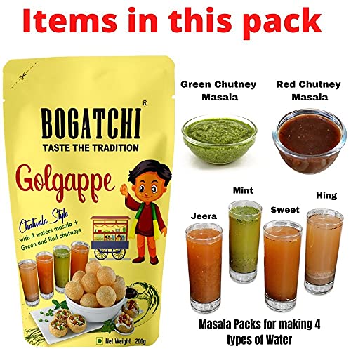 BOGATCHI Baked Atta Golgappe-Panipuri-Puchka with 4 Waters Masala and Red & Green Chutneys | Microwave Pani Puri Pappad | Golgappe Packet ReadyMade |Home Made Fiber Rich Microwave Golgappa 200g