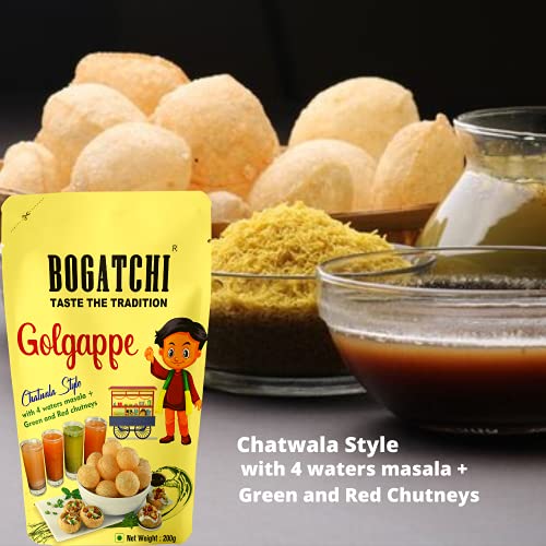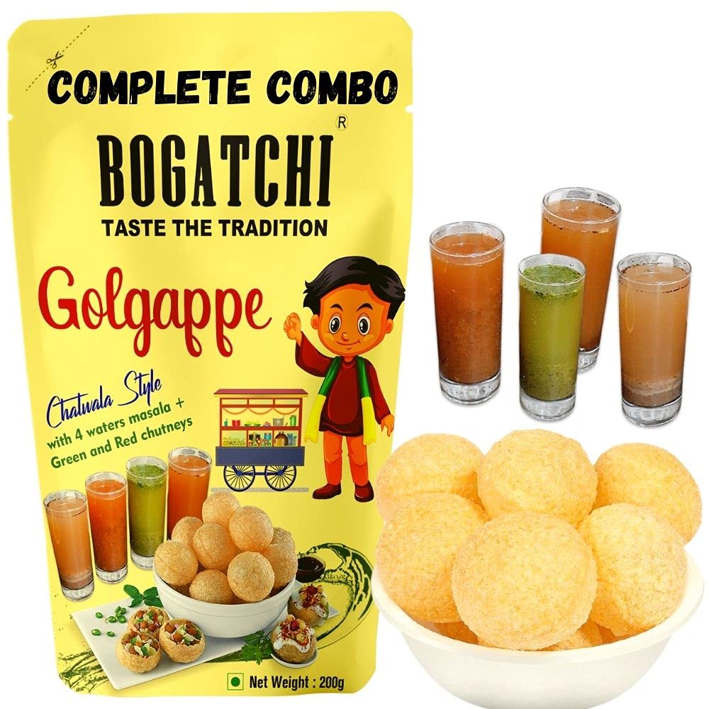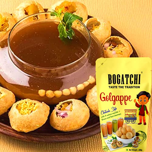 BOGATCHI Golgappe Pani Puri will become your favourite snack once you taste it. We believe in Simple good food that's why our gol gappe is made of best natural ingredients. To have full chatwala experience the packet includes 4 waters masala green and red chutneys. These ready to fry atta golgappe can be made within a minutes. The quality is good. We offer clean and air-tight pani puri packets for keeping golgappa puris fresh and not loosing their taste.