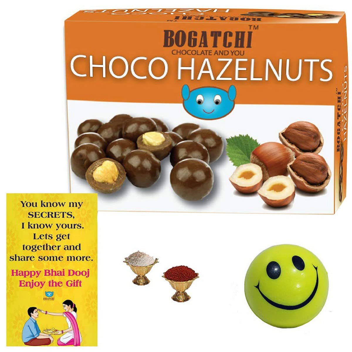 Bogatchi chocolate coated nuts and fruits gift box is the best gift on bhai dooj. Best quality Turkish hazelnuts coated with 18 % dark chocolate makes best gift for bhai dooj. The exotic flavours of chocolate are sure to tickle your taste buds. These chocolates are perfect for the any age group who are young at heart. These chocolates are just the right gift for any season. This is an amazing gift to send to your girlfriend boyfriend brother sister or parents. Send these gifts to your near ones and surprise them.