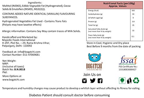 Bogatchi sugar free chocolate bar contains no sugar. The sweetener used is maltitol which is a standard sugar substitute. This makes the chocolate relatively healthier than regular chocolate with sugar. This product contains zero carbohydrates from sugar. Caution - diabetes patients should consult doctor before consuming.