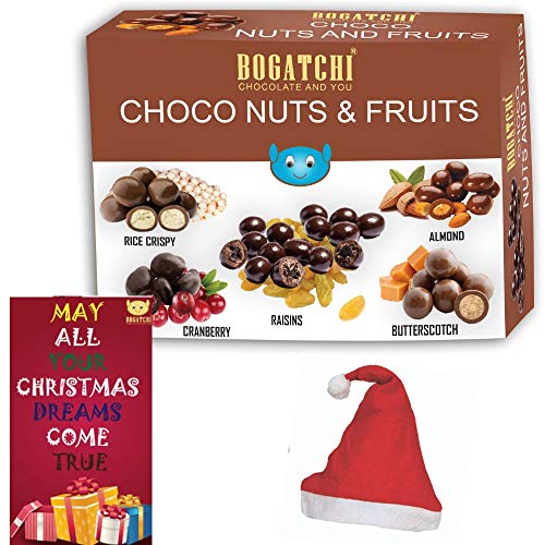 Bogatchi chocolate coated nuts are part of rich dry fruit collection range. It comes with dark chocolate coated on carefully selected almonds raisins cashews hazelnuts cranberries and butterscotch and rice crunchy. It makes best Christmas gift for friends brother sister girl friend boy friend mother father Christmas chocolates for friends brother sister girl friend boy friend mother father with gift happy Christmas gift hamper happy Christmas chocolates Christmas chocolates gift Christmas chocolates combo Christmas chocolates pack Christmas chocolates for kids personalized chocolates handmade chocolates personalized gifts best gift for Christmas best gift pack for friends brother sister girl friend boy friend mother father. Christmas gift for friends