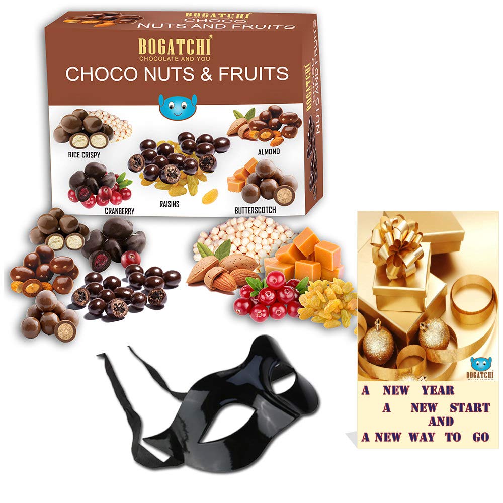 BOGATCHI Chocolate Coated Assorted Nuts and Fruits New Year Special Rich Dry Fruit Collection Gift 200g + Free New Year Greeting Card+ Party Mask