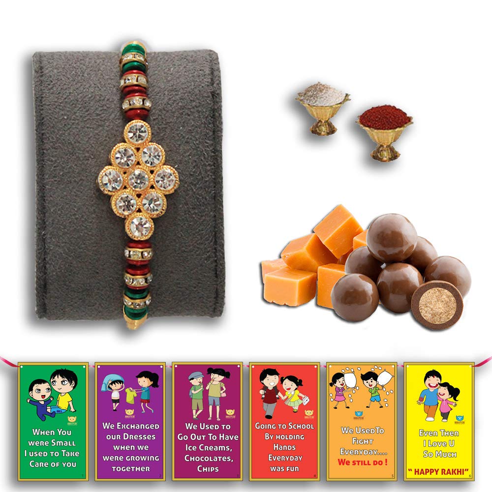 • FREE Dark Chocolate Coated Butterscotch Nuts/Crispy - 50g. Beautiful Rakhi for best Brother. Value for Money Combo