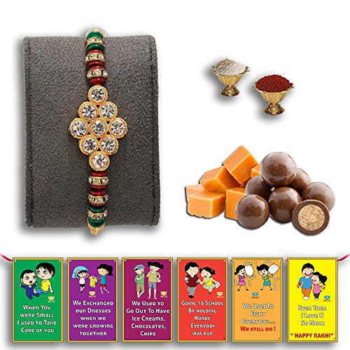 Elegant beautiful rahi set veera rakhi blessings for brother. Blessings of his happiness and long life of brother best rakhi for brother unique design rakhi designer rakhi for brother rakshabandhan gift for brother. Free chocolate coated butterscotch nuts or rice crispy.