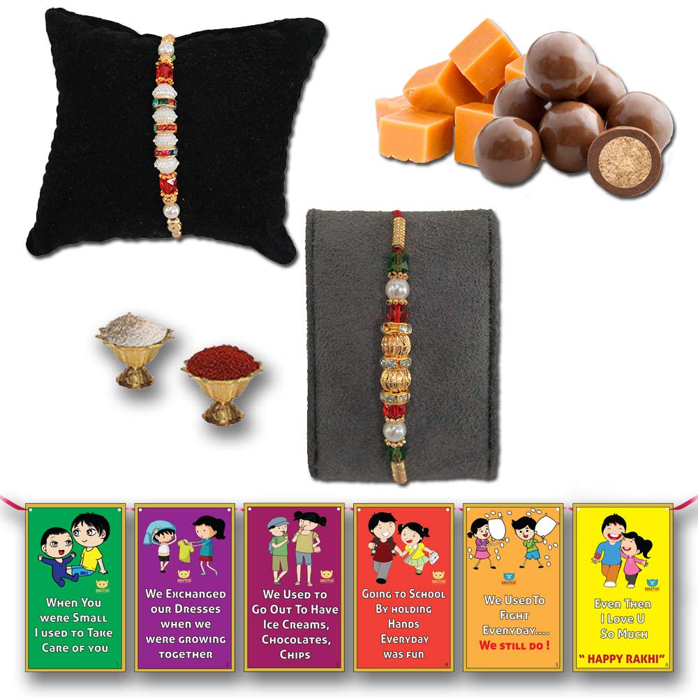 Elegant beautiful rahi set veera rakhi blessings for brother. Blessings of his happiness and long life of brother best rakhi for brother unique design rakhi designer rakhi for brother rakshabandhan gift for brother. Free chocolate coated butterscotch nuts or rice crispy.