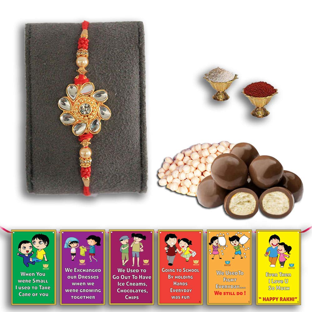 • FREE Dark Chocolate Coated Butterscotch Nuts/Crispy - 50g. Beautiful Rakhi for best Brother. Value for Money Combo