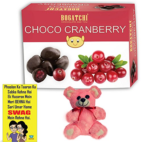 BOGATCHI Chocolate Coated Cranberry 100g + Free Bhai Dooj Greeting Card + Teddy with Bhai Dooj Gift Hamper for Sister