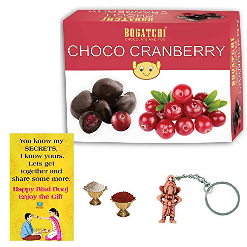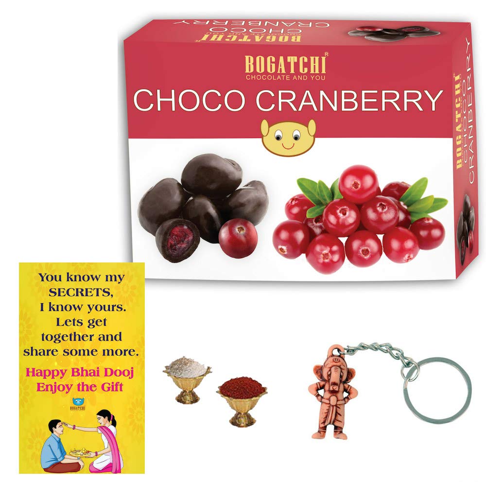 BOGATCHI Chocolate Coated Cranberry 200g Bhai Dooj Gift Hamper for Brother+ Free Bhai Dooj Greeting Card + Beautiful Ganesha Key Chain + Roli Chawal