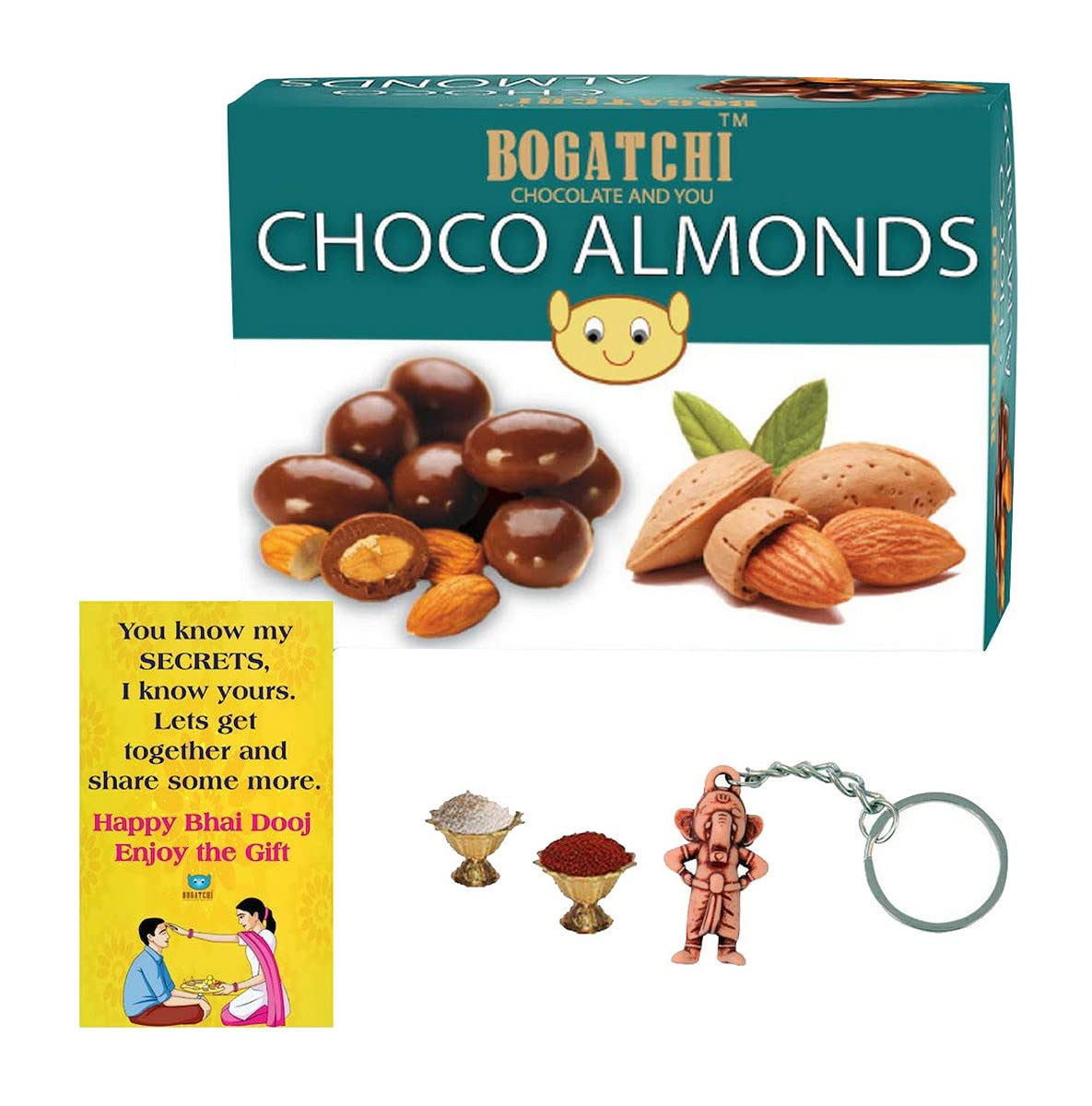 BOGATCHI Chocolate Coated Hazelnut 100g Bhai Dooj Gift Hamper for Brother+ Free Bhai Dooj Greeting Card + Beautiful Ganesha Key Chain + Roli Chawal
