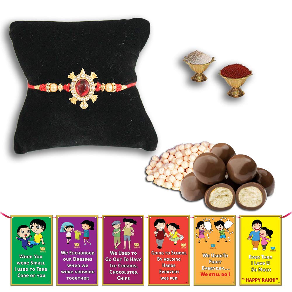 • FREE Dark Chocolate Coated Butterscotch Nuts/Crispy - 50g. Beautiful Rakhi for best Brother. Value for Money Combo