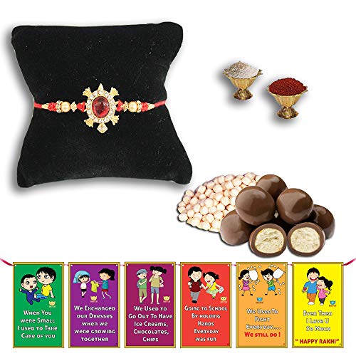 Elegant beautiful rahi set veera rakhi blessings for brother. Blessings of his happiness and long life of brother best rakhi for brother unique design rakhi designer rakhi for brother rakshabandhan gift for brother. Free chocolate coated butterscotch nuts or rice crispy.