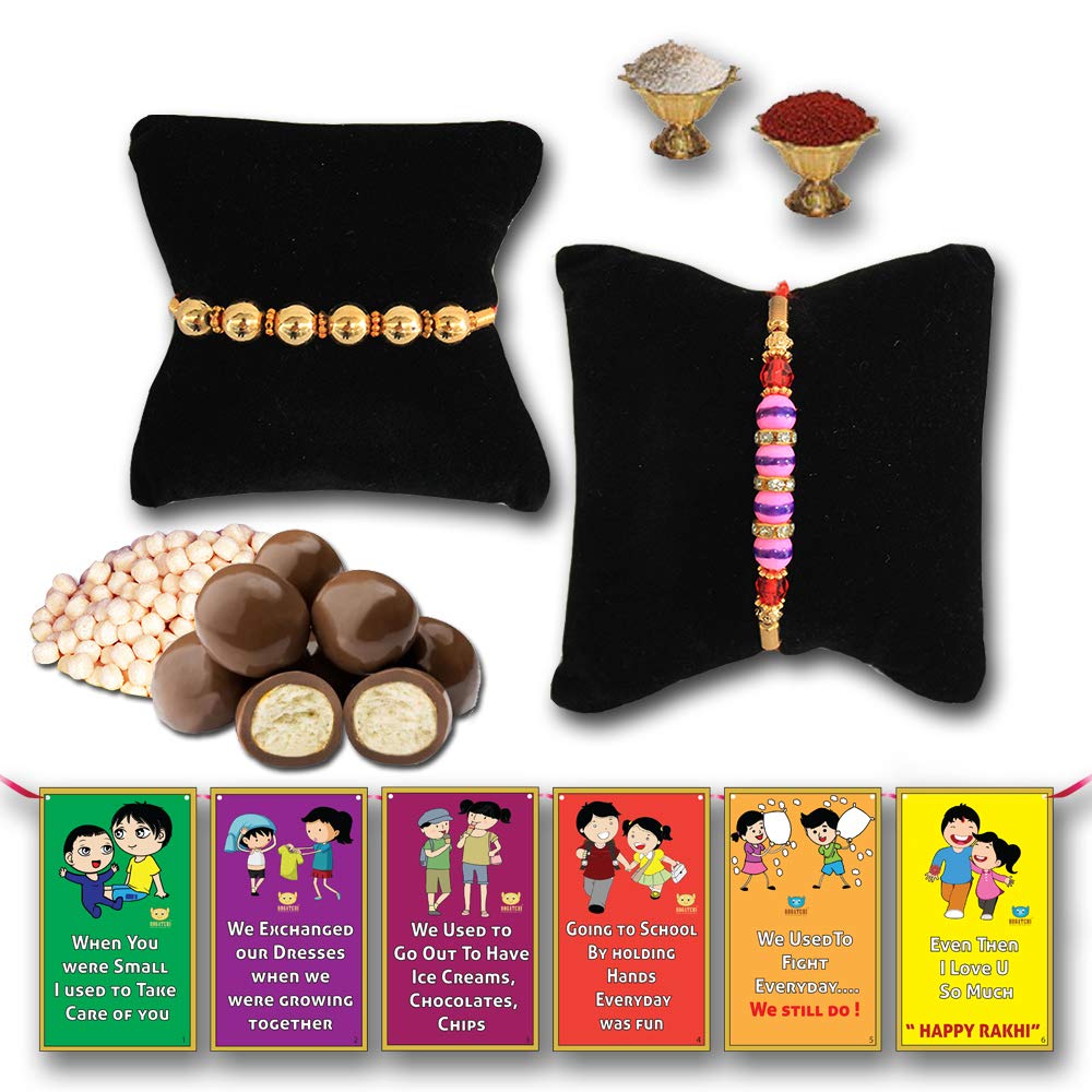 BOGATCHI Chocolate Coated Jumbo Crispy / Butterscotch Nuts - 50g FREE with Beautiful Looking 2 Golden Beads Rakhi Set of 2 Rakhi Best Rakhi for Brother + FREE Roli Chawal + FREE Rakhi Special Brother Sister Story Cards Set