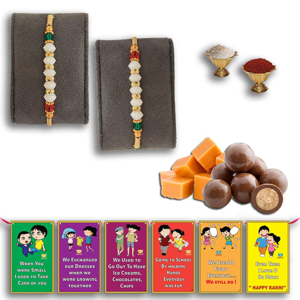 BOGATCHI Chocolate Coated Jumbo Crispy / Butterscotch Nuts - 50g FREE with Beautiful Looking Colourful Beads Rakhi Set of 2 Rakhi Best Rakhi for Brother + FREE Roli Chawal + FREE Rakhi Special Brother Sister Story Cards Set