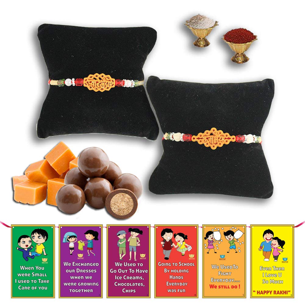 BOGATCHI Chocolate Coated Jumbo Crispy / Butterscotch Nuts - 50g FREE with Elegant Looking Bhaiyan Rakhi Set of 2 Rakhi Best Rakhi for Brother + FREE Roli Chawal + FREE Rakhi Special Brother Sister Story Cards SetGG