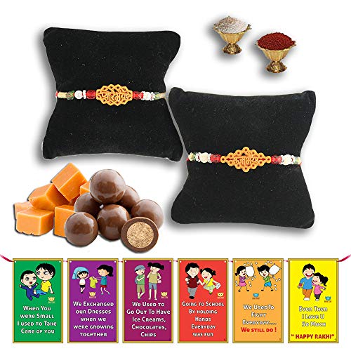 Elegant beautiful rahi set veera rakhi blessings for brother. Blessings of his happiness and long life of brother best rakhi for brother unique design rakhi designer rakhi for brother rakshabandhan gift for brother. Free chocolate coated butterscotch nuts or rice crispy.
