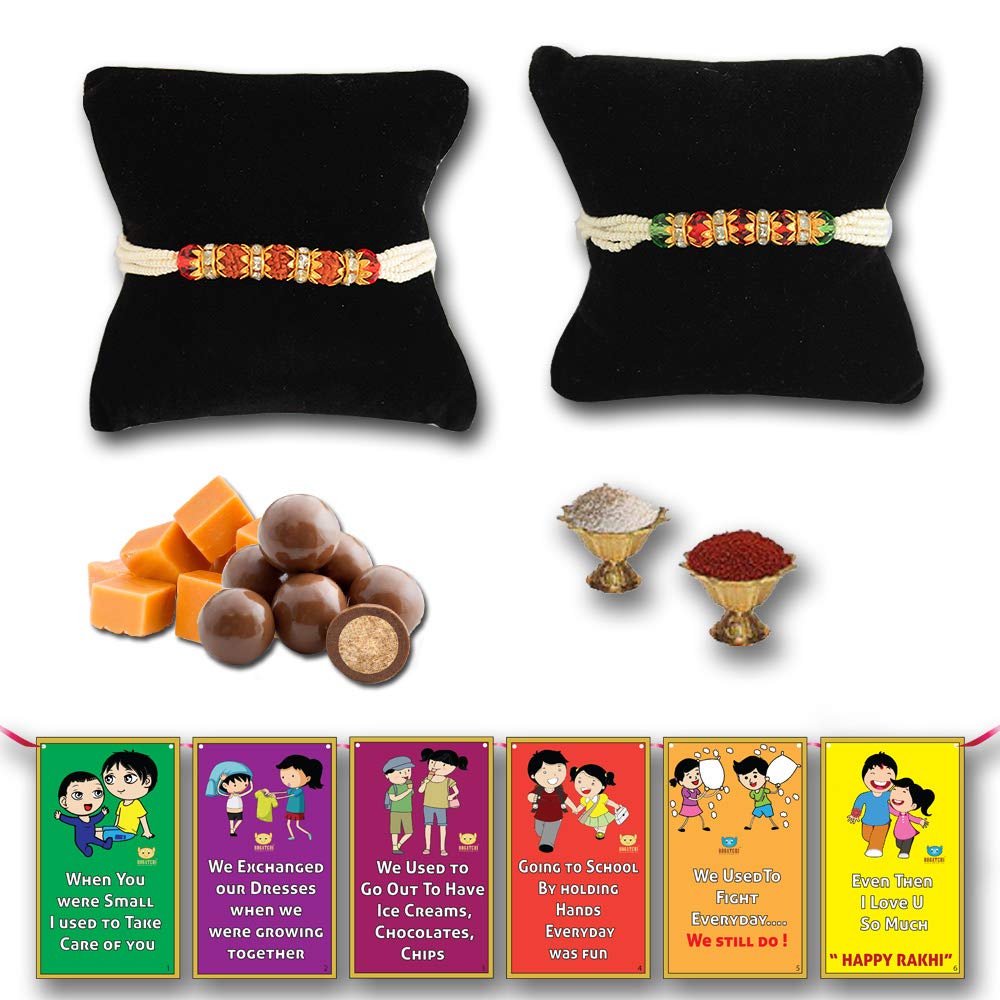 BOGATCHI Chocolate Coated Jumbo Crispy / Butterscotch Nuts - 50g FREE with Pack of 2 Unique Type RakhiComplete Rakhi Set for bothers + FREE Roli Chawal + FREE Rakhi Special Brother Sister Story Cards Set