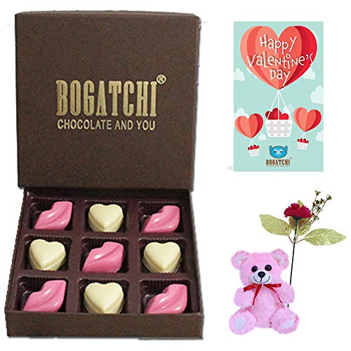 BOGATCHI Chocolate Hearts and Kisses Valentine Gifts for Girlfriend- Boyfriend- Husband-Wife9pcs + Free Valentines Day Card with Rose and Teddy