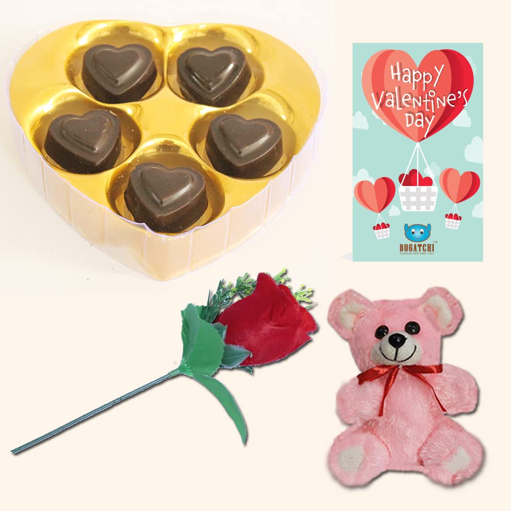 BOGATCHI Chocolates Valentine Day Gift for Boyfriend 5 Choco Heart Box + Free V-Day Card + Free Rose & Teddy