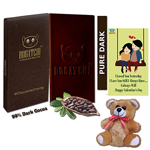 BOGATCHI Chocolates Valentine Day Gift for Girlfriend 99% Dark Chocolate Bar 80g (NO Sugar) Pure + Free V-Day Card + Free Teddy