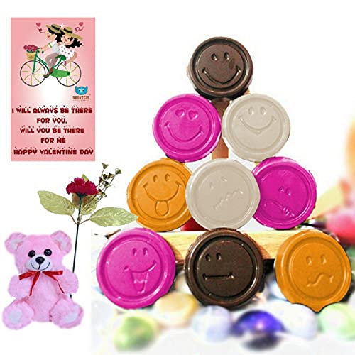 Bogatchi Colorful Chocolate Smileys (DarkWhiteMango and Pink Chocolate) (9 Pieces) Teddy Bear Soft Toy and Red Rose & Greeting Card