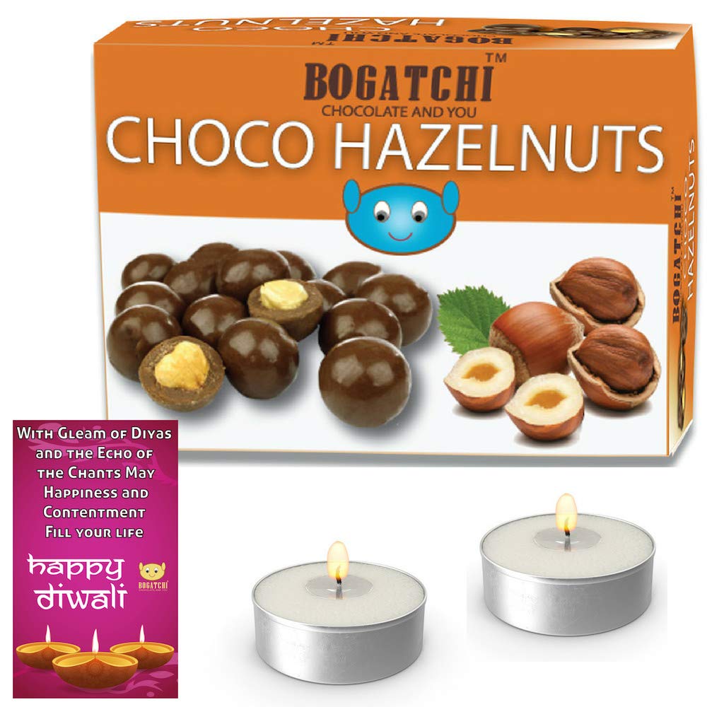 BOGATCHI Complete Diwali Gift Hamper for Friends Chocolate Coated Hazelnut 200g + Free Diwali Greeting Card + Free Tea Light