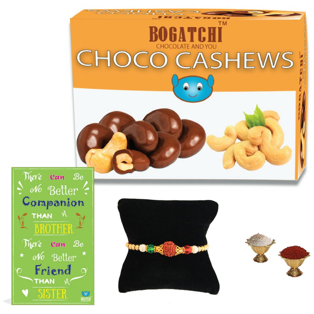 BOGATCHI Complete Rakhi Gift Hamper for Brother Chocolate Coated Cashews 200g + Free Rakhi Greeting Card + Free Rakhi + Roli Chawal