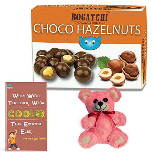 BOGATCHI Complete Rakhi Gift Hamper for Sister Chocolate Coated Hazelnut 200g + Free Rakhi Greeting Card + Free Teddy
