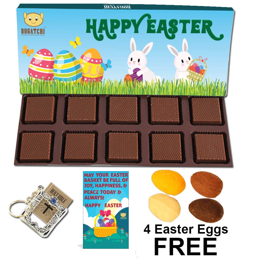 BOGATCHI Easter Chocolates Gift Box 10pcs + 4 Easter Eggs + Holy Bible Key Chain + Free Happy Easter Card