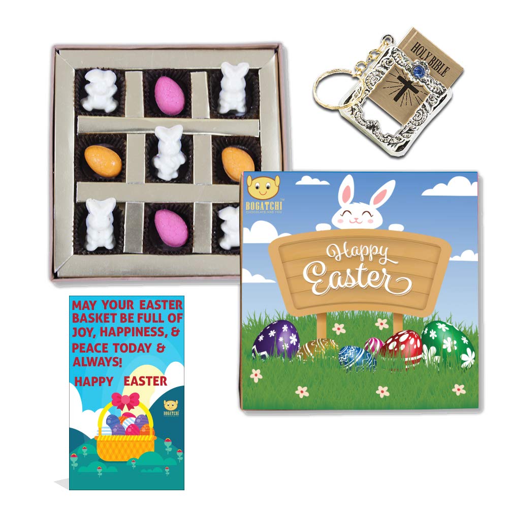 BOGATCHI Easter Set with Chocolate 5 Bunnies and 4 Eggs + Free Happy Easter Card + Holy Bible Key Chain