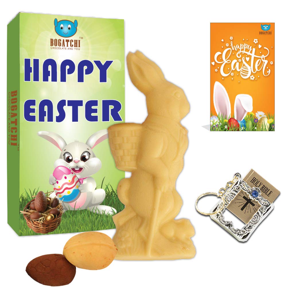 BOGATCHI Easter Special White Chocolate Bunny 2 Almond Easter Eggs + Holy Bible Key Chain + Free Happy Easter Card